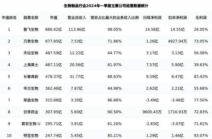 特宝生物最新报告期数据为一季度,下表汇总了生物制品行业内市值靠前的公司一季度主要经营数据