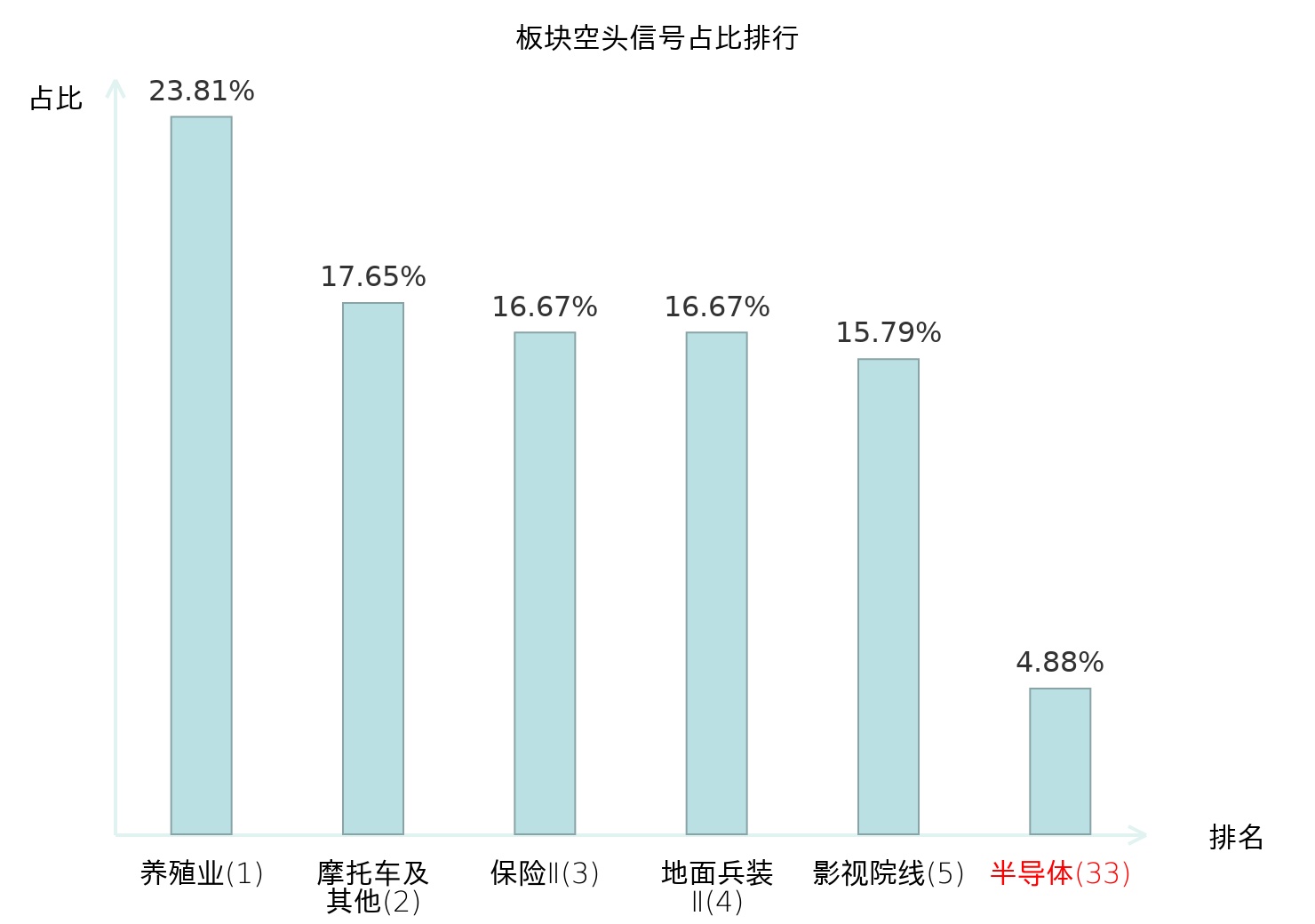 全市场所有行业板块中主力空头信号占比排名中,养殖业板块位居第一。养殖业板块名次提升最快,较昨日上升114位。