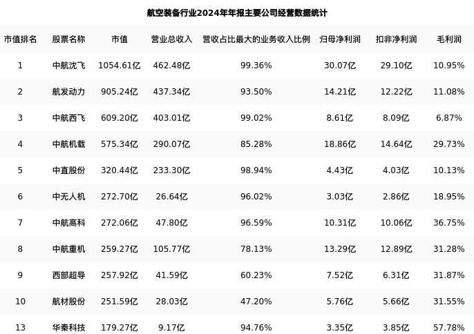 华秦科技最新报告期数据为年报,下表汇总了航空装备行业内市值靠前的公司年报主要经营数据