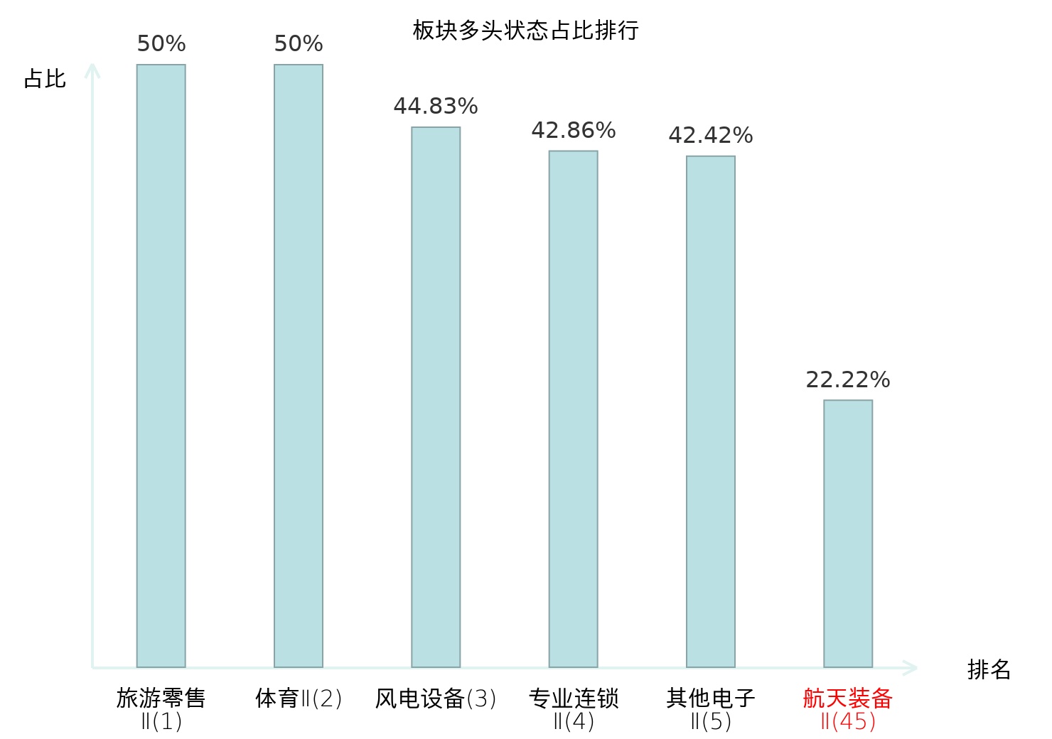 全市场所有行业板块中主力多头状态占比排名中,旅游零售Ⅱ板块位居第一。化妆品板块名次提升最快,较昨日上升66位。