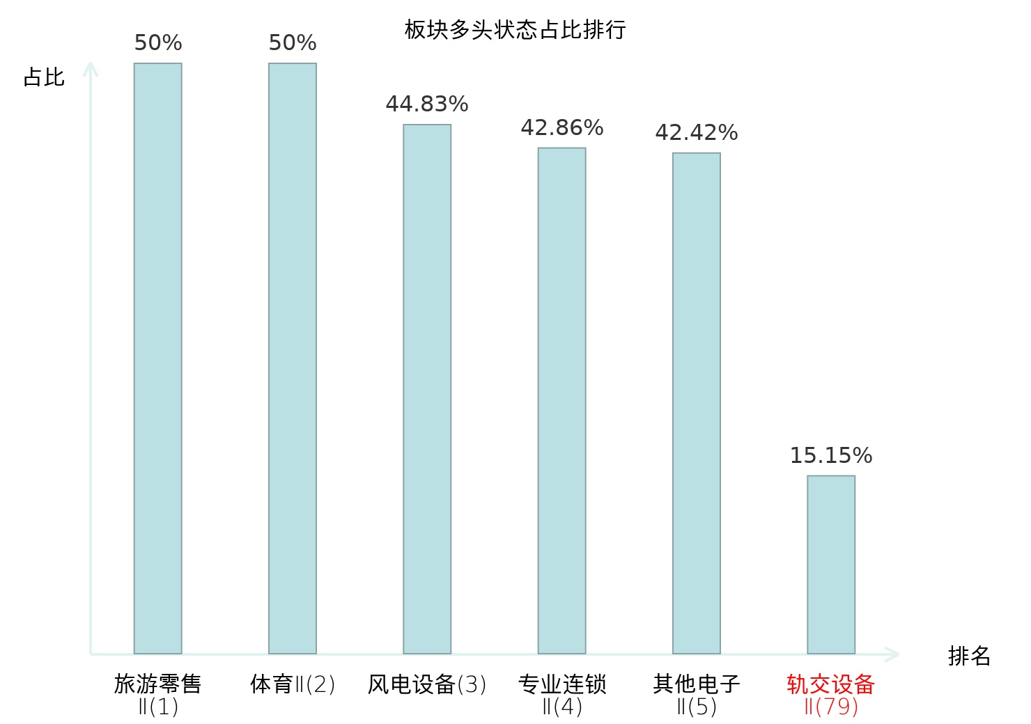 全市场所有行业板块中主力多头状态占比排名中,旅游零售Ⅱ板块位居第一。化妆品板块名次提升最快,较昨日上升66位。