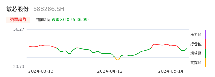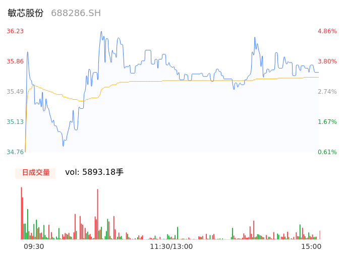05月14日,敏芯股份收报35.78,股价涨幅3.56%,成交金额2102.03万元,换手率1.10%。