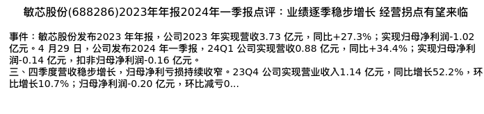 值得注意的是:2024年04月民生证券的方竞分析师,首次发布关于敏芯股份的研究报告,标题为:敏芯股份(688286)2023年年报2024年一季报点评:业绩逐季稳步增长 经营拐点有望来临。