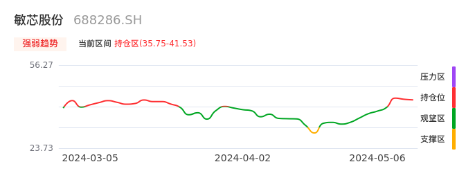我们来看一下该股的九方特色指标强弱趋势的情况:敏芯股份近日从观望区上穿到持仓区。股价短期站稳多头区域,上升动能仍较为充足,可积极关注。后续重点关注上方压力位:41.53元是否能突破上攻。