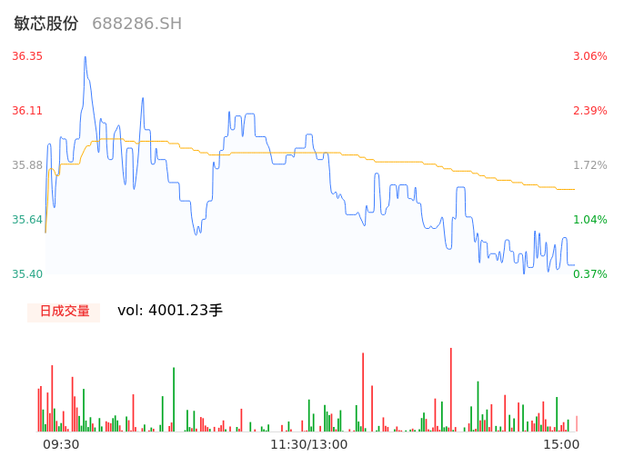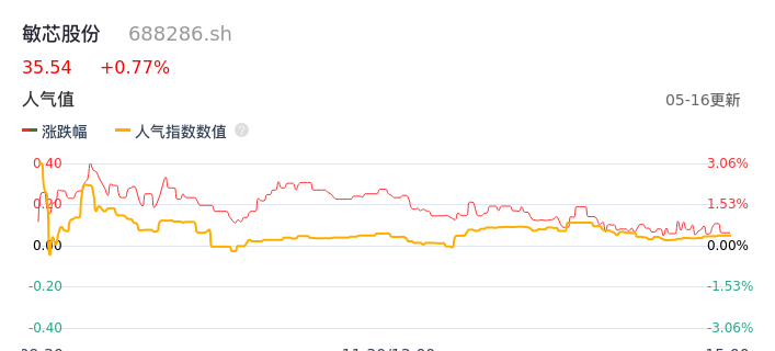 05月16日,敏芯股份收报35.54,股价涨幅0.77%,成交金额1431.00万元,换手率0.75%。