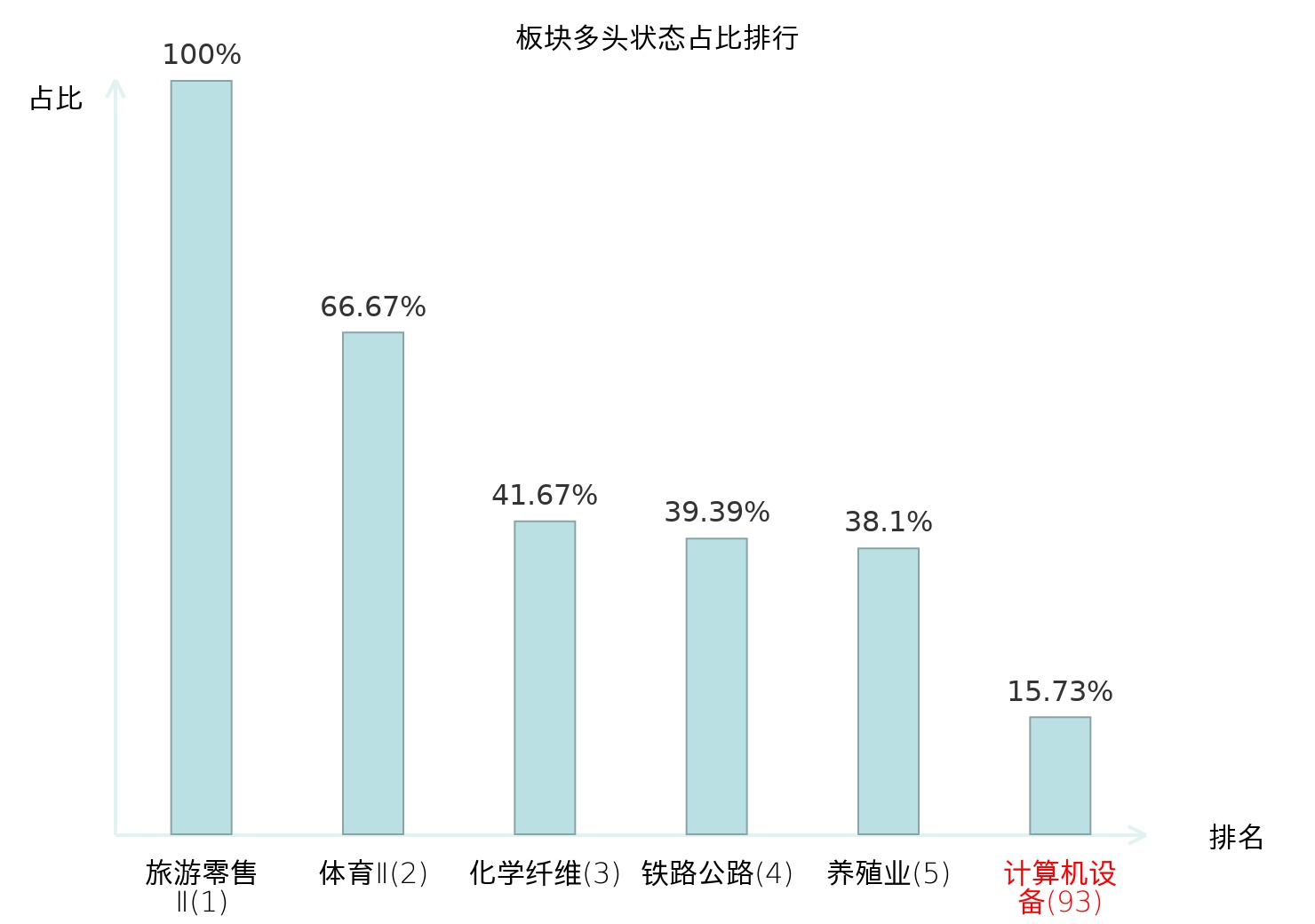 全市场所有行业板块中主力多头状态占比排名中,旅游零售Ⅱ板块位居第一。旅游零售Ⅱ板块名次提升最快,较昨日上升130位。