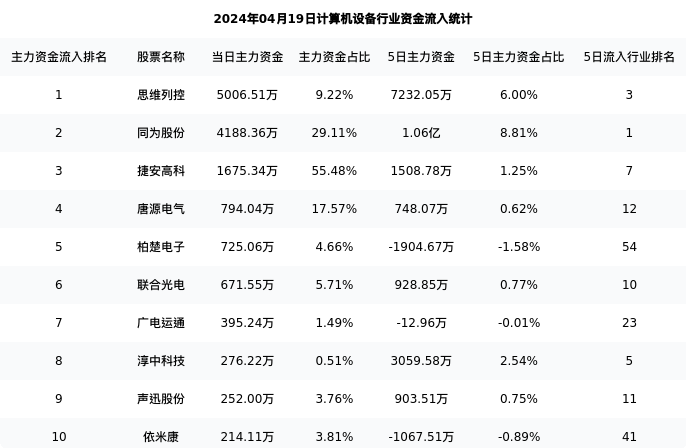 从主力资金流向来看,计算机设备行业今日主力资金流入45.99亿元,在所有申万二级行业中排名:19/131。