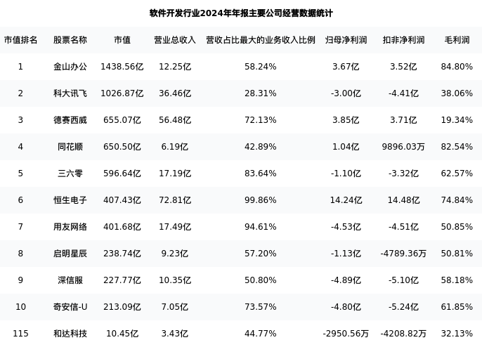 和达科技最新报告期数据为年报,下表汇总了软件开发行业内市值靠前的公司年报主要经营数据