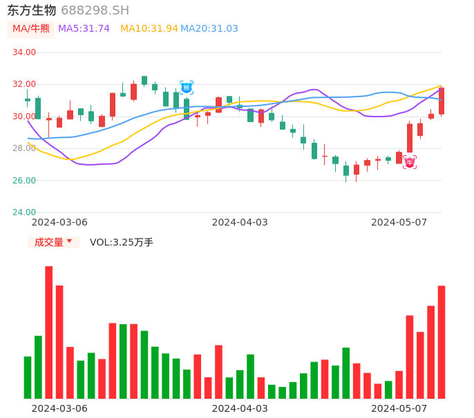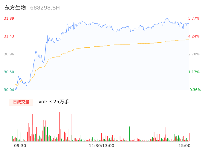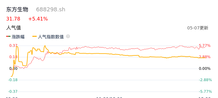 05月07日,东方生物收报31.78,股价涨幅5.41%,成交金额1.02亿元,换手率1.61%。