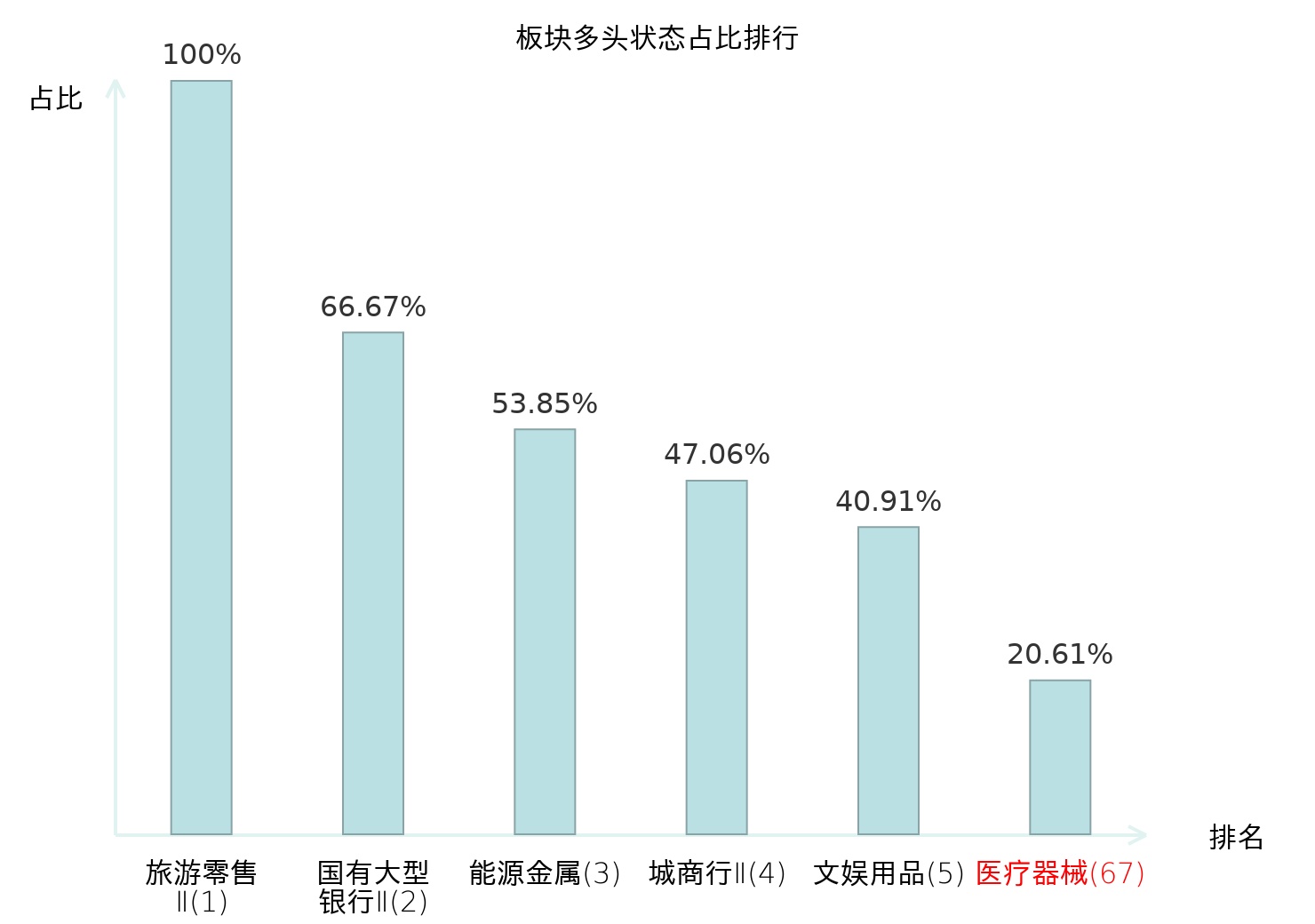 全市场所有行业板块中主力多头状态占比排名中,旅游零售Ⅱ板块位居第一。保险Ⅱ板块名次提升最快,较昨日上升57位。