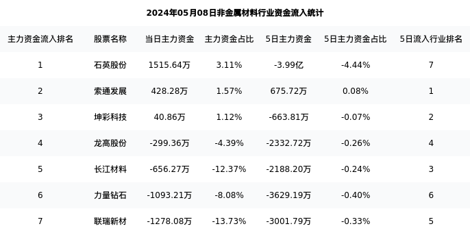 从主力资金流向来看,非金属材料行业今日主力资金流入3.47亿元,在所有申万二级行业中排名:93/131。