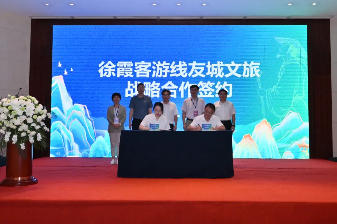 庐山市(局)文旅委副主任葛陈与江阴市文体广电和旅游局党委委员、副局长张琳签约。