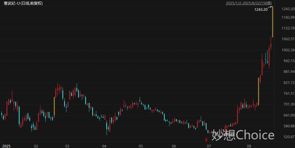 科创板AI芯片第一股寒武纪周五收盘录得20CM涨停,触及1243.2元/股,刷新历史新高,最新总市值超5200亿元。拉长时间来看,寒武纪股价自7月低点迄今累计最大涨幅138.77%。此前,寒武纪于8月14日公告称,近期关注到网上传播的关于公司在某厂商预定大量载板订单、收入预测、新产品情况、送样及潜在客户、供应链等相关信息,均为误导市场的不实信息。寒武纪8月15日公告,公司收到上交所审核意见,确认本次向特定对象发行A股股票申请符合发行、上市及信息披露要求。