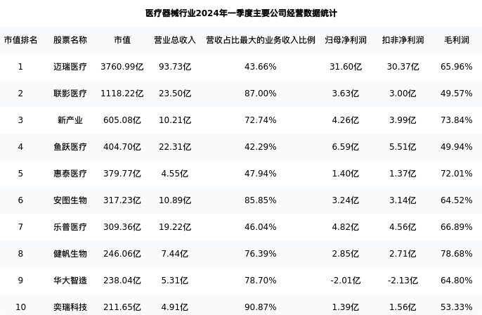 奕瑞科技最新报告期数据为一季度,下表汇总了医疗器械行业内市值靠前的公司一季度主要经营数据
