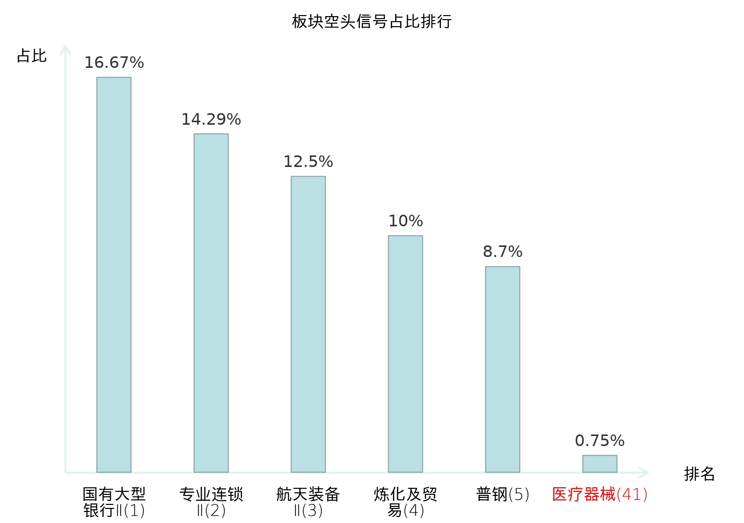 全市场所有行业板块中主力空头信号占比排名中,国有大型银行Ⅱ板块位居第一。食品加工板块名次提升最快,较昨日上升103位。