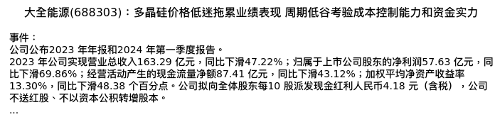 值得注意的是:2024年05月中原证券的唐俊男分析师,首次发布关于大全能源的研究报告,标题为:大全能源(688303):多晶硅价格低迷拖累业绩表现 周期低谷考验成本控制能力和资金实力。