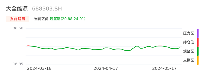我们来看一下该股的九方特色指标强弱趋势的情况:大全能源自05月13日从持仓区下穿到观望区。股价近期持续下跌后,短期出现止跌迹象。后续重点关注能否再次站上多空分界点:24.91元。如未能有效突破则可能进入新一轮空头行情。