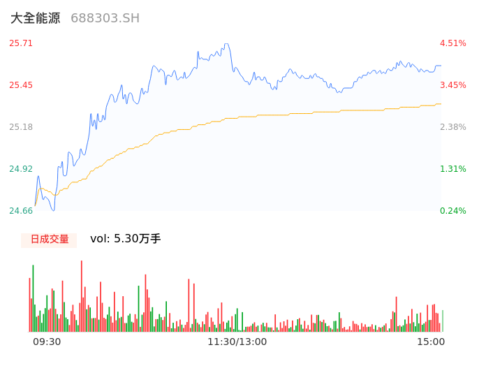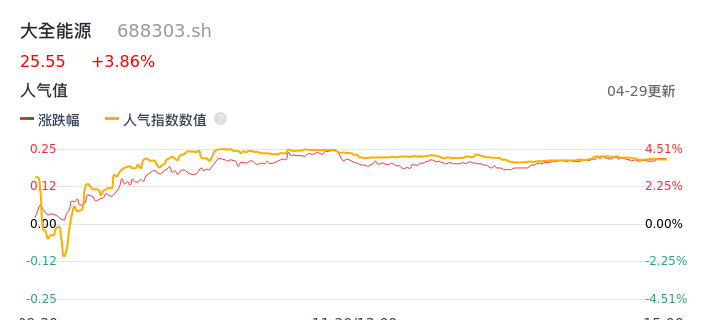 04月29日,大全能源收报25.55,股价涨幅3.86%,成交金额1.34亿元,换手率1.02%。