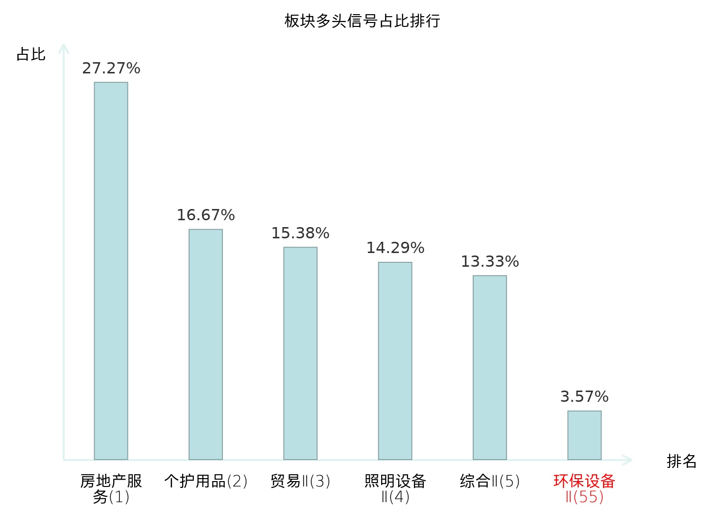 全市场所有行业板块中主力多头信号占比排名中,房地产服务板块位居第一。房地产服务板块名次提升最快,较昨日上升116位。