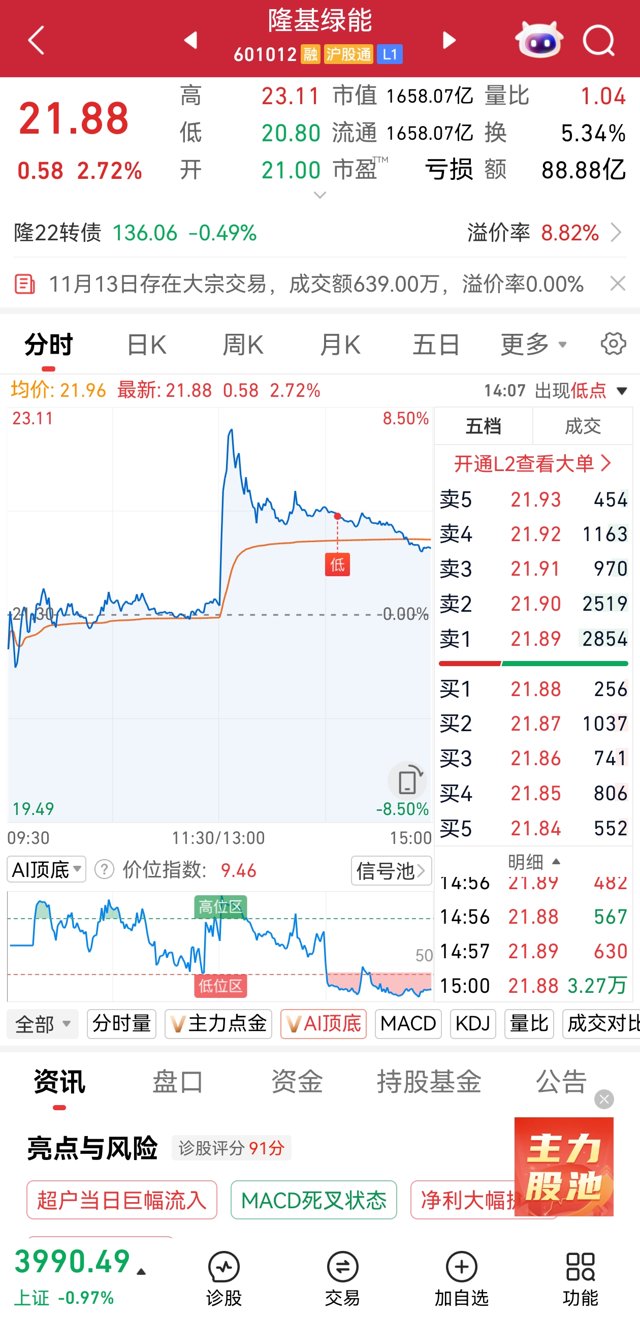 光伏概念午后异动,隆基绿能盘中直线拉升涨超8%,随后涨幅收窄,至收盘报21.88元/股,最新市值为1658.1亿元。