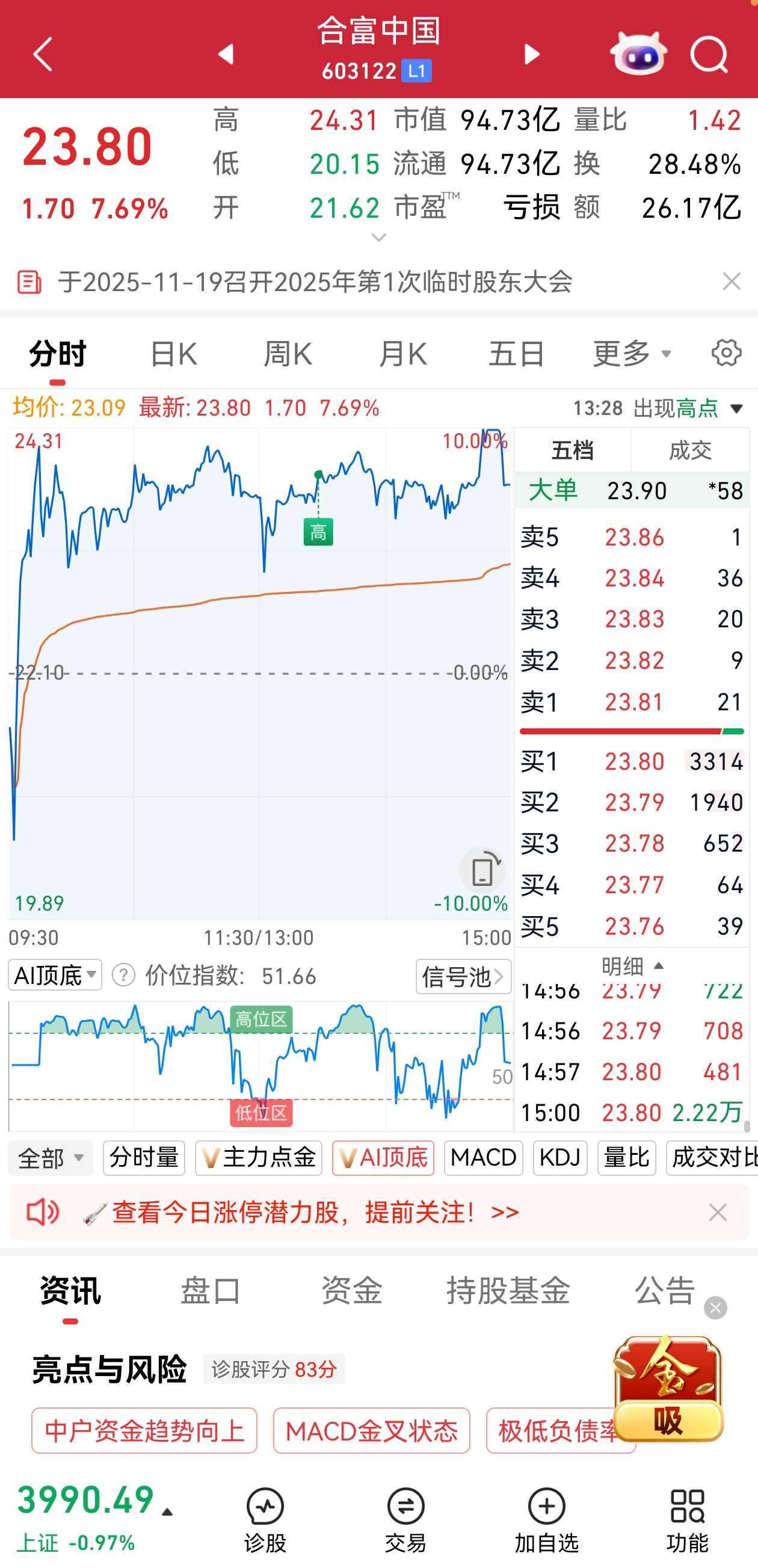 合富中国11月13日晚发布《股票交易风险提示公告》称,公司股价累计涨幅已严重偏离基本面,投资者参与交易可能面临较大风险。如公司股价进一步异常上涨,公司可能申请停牌核查。