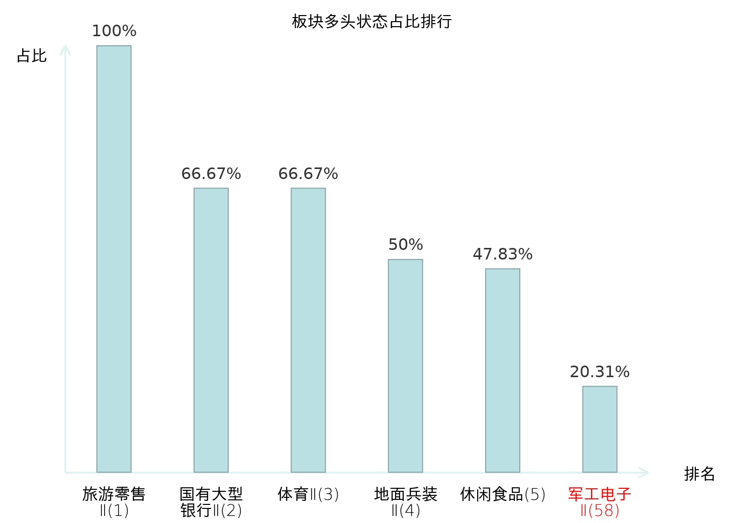 全市场所有行业板块中主力多头状态占比排名中,旅游零售Ⅱ板块位居第一。航空机场板块名次提升最快,较昨日上升80位。