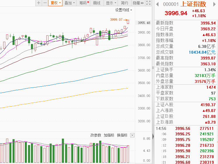 大盘分析及后市展望:周一早盘,A股集体高开,沪指高开0.48%,深成指高开1.20%,创业板指高开1.75%。电子化学品、苹果概念、存储芯片、光刻机、先进封装、AIPC、PCB概念等开盘领涨;煤炭、贵金属、页岩气等小幅低开。热点方面,存储芯片板块集体高开,消息面上,近期存储芯片价格大幅上涨,产业链人士称部分存储晶圆厂已暂停部分产品报价。煤炭、保险、银行等红利板块探底回升,钢铁、有色、稀土永磁、中字头拉升;上证指数续创年内新高,三大股指均涨超1%,沪指逼近4000点整数关口;红利板块则涨幅收窄。市场呈现放量上涨格局,成交量重返2万亿之上。