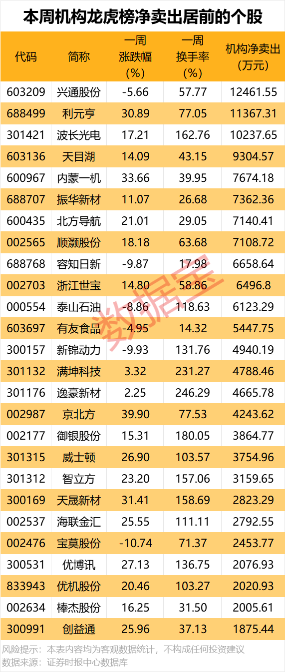 一周龙虎榜:4股获机构大手笔净买入超1亿元