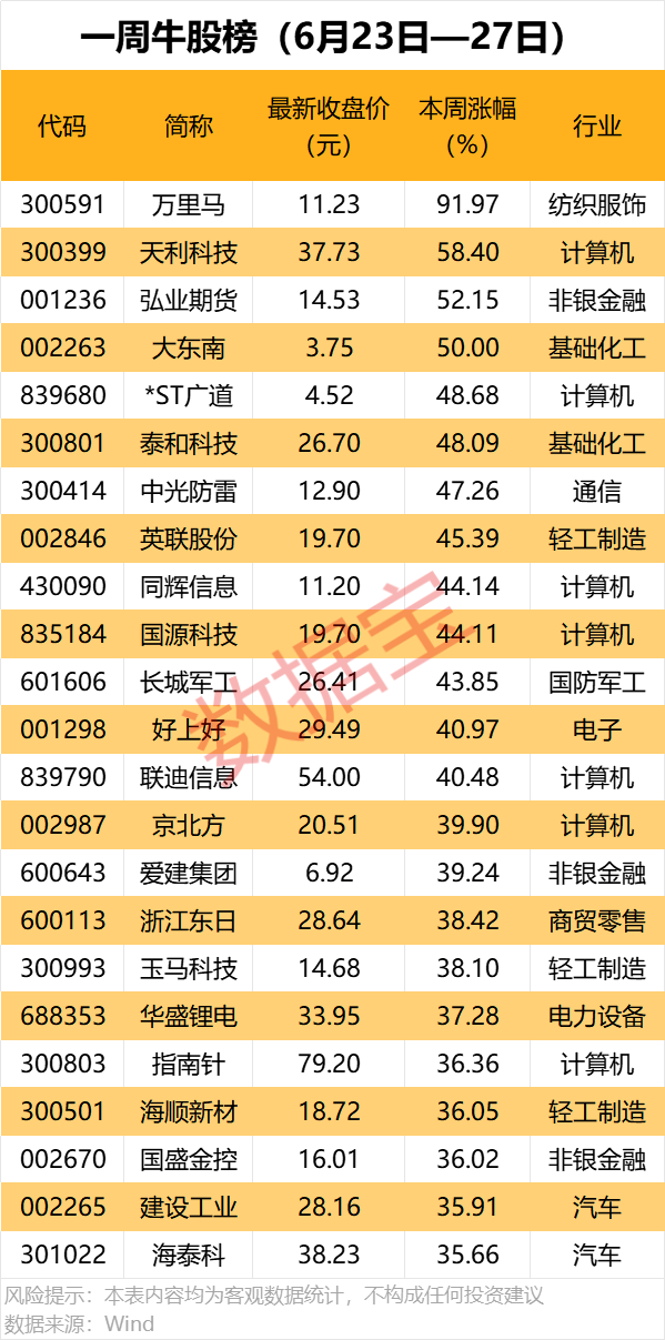 个股方面,本周超4800股上涨,49股涨幅超30%。其中,涨幅最大的是万里马,累计上涨91.97%;天利科技、弘业期货、大东南本周累计涨幅均在50%及以上。