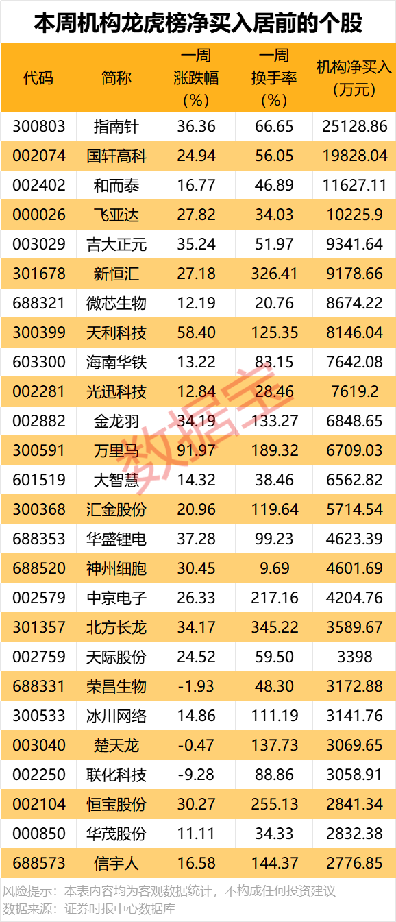 龙虎榜数据显示,本周机构专用席位共现身98股的龙虎榜,净买入52股,净卖出46股。其中,38股获机构净买入均超千万元,指南针、国轩高科、和而泰、飞亚达净买入金额超1亿元。
