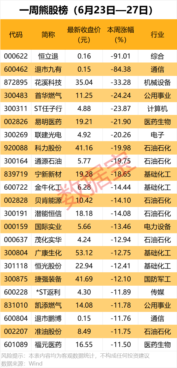 本周累计下跌的个股中,7股跌幅在20%以上,恒立退和退市九有累计跌超80%。