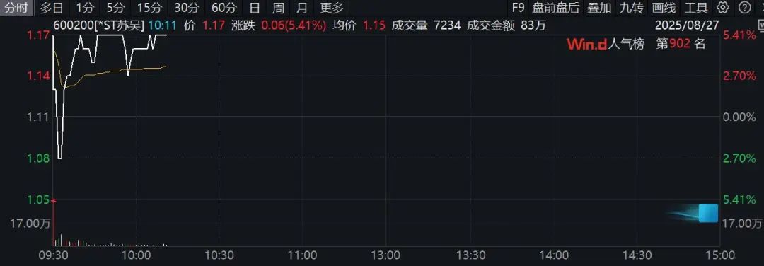 个股方面,*ST苏吴(600200)盘中上演“地天板”,成交金额超1亿元。