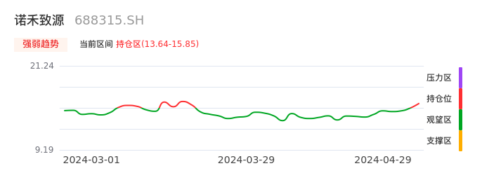 我们来看一下该股的九方特色指标强弱趋势的情况:诺禾致源近日从观望区上穿到持仓区。股价短期站稳多头区域,上升动能仍较为充足,可积极关注。后续重点关注上方压力位:15.85元是否能突破上攻。