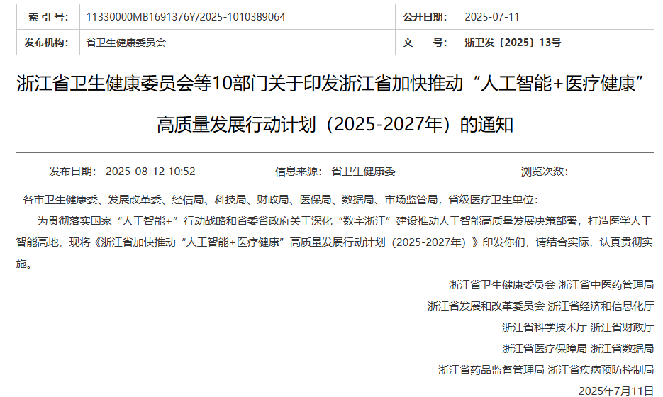 《科创板日报》8月13日讯(编辑 宋子乔) 日前,浙江省卫生健康委员会等10部门印发《浙江省加快推动“人工智能+医疗健康”高质量发展行动计划(2025—2027年)》。其中提到,到2027年,全面建成国家人工智能医疗行业应用基地,打造以安诊儿医疗大模型为核心的医疗智能体集群,培育50个以上高质量行业语料库和专病专科模型,突破转化10项以上医学AI核心技术,建设面向公众、医生、医院、科研、产业、政府等6大领域100个以上医疗健康重点场景,培育一批医学人工智能创新型企业和复合型人才,构建从基础设施保障、关键技术攻关到创新应用示范的医疗人工智能创新链、服务链、产业链,形成辐射全国的政企研医协同网络。