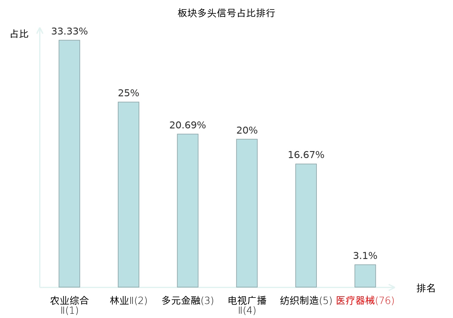 全市场所有行业板块中主力多头信号占比排名中,农业综合Ⅱ板块位居第一。农业综合Ⅱ板块名次提升最快,较昨日上升127位。