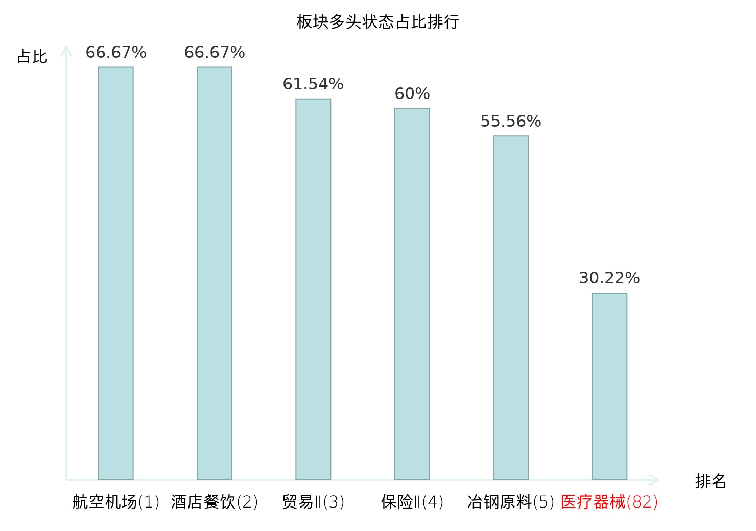 全市场所有行业板块中主力多头状态占比排名中,航空机场板块位居第一。农业综合Ⅱ板块名次提升最快,较昨日上升64位。