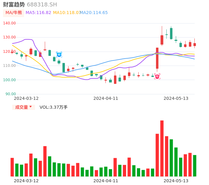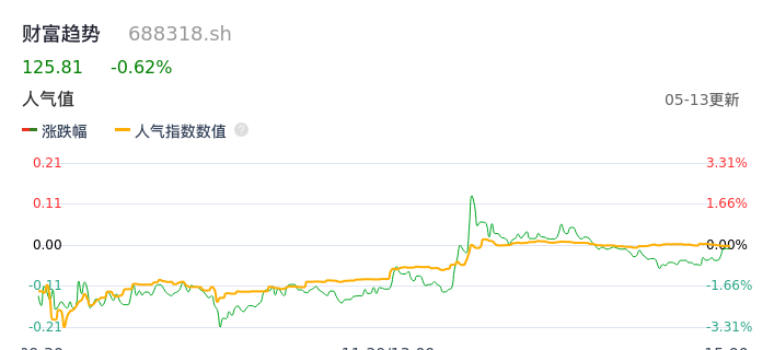05月13日,财富趋势收报125.81,股价涨幅-0.62%,成交金额4.23亿元,换手率2.58%。