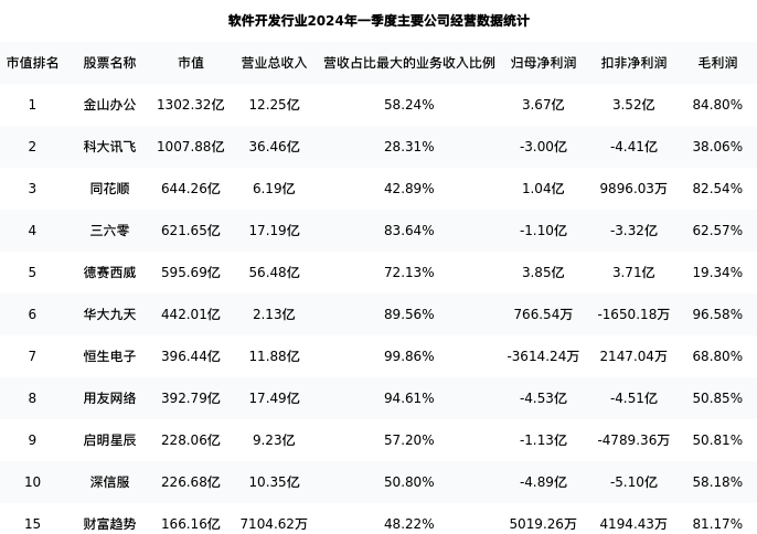 财富趋势最新报告期数据为一季度,下表汇总了软件开发行业内市值靠前的公司一季度主要经营数据