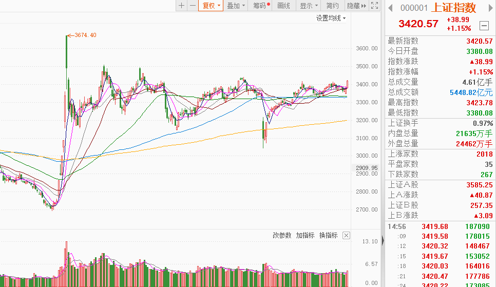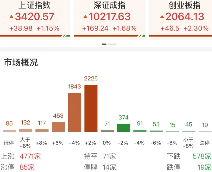 展望后市,沪指再次站上3400点,意味着市场已经突破了此前的阻力位,为后续的进一步上涨奠定了基础。然而,市场突破后能否持续,仍需观察政策面和资金面的进一步变化。若后续资金不能持续流入或市场情绪出现转变,可能会对突破的持续性构成挑战。因此,投资者在追高时应保持理性,避免盲目跟风。总体来看,今日A股市场的强势表现,不仅反映了市场对经济基本面的乐观预期,也体现了投资者对政策支持的积极反应。随着市场情绪的逐步修复,预计未来一段时间内,A股市场仍将保持震荡向上的趋势,但投资者也需密切关注市场动态,合理配置资产,把握市场节奏。