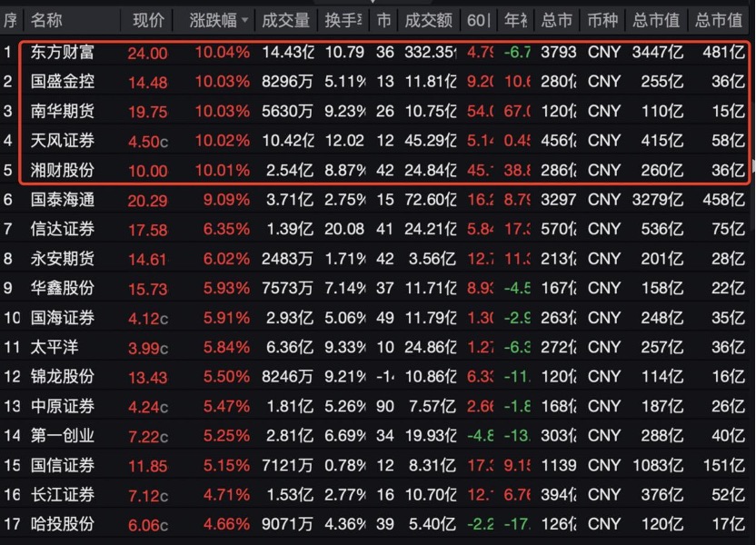 券商股持续爆发,A股上市券商无一下跌,东方财富、国盛金控、天风证券、湘财证券等多股涨停,近460亿元市值的国泰海通大涨9.09%。此外,信达证券、国海证券、太平洋、中原证券、第一创业等涨幅超5%。