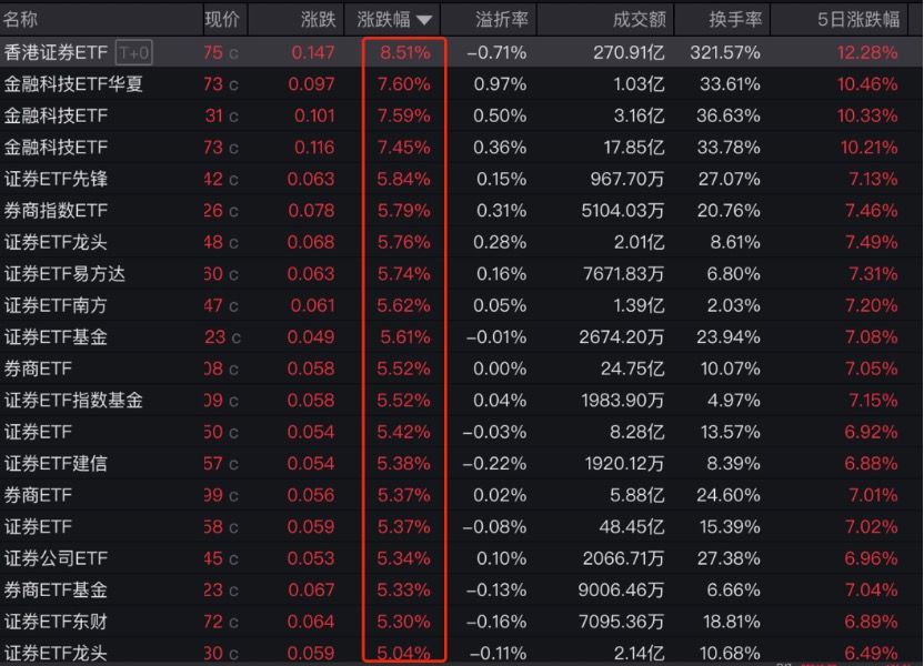 受益于此,券商、金融科技主题ETF涨幅居前,易方达香港证券ETF大涨8.51%,换手率超过321%。此外,华夏、博时、华宝等金融科技ETF,国联安、华富、富国、易方达等旗下证券ETF均大涨。全市场20只证券主题ETF涨幅超过5%。