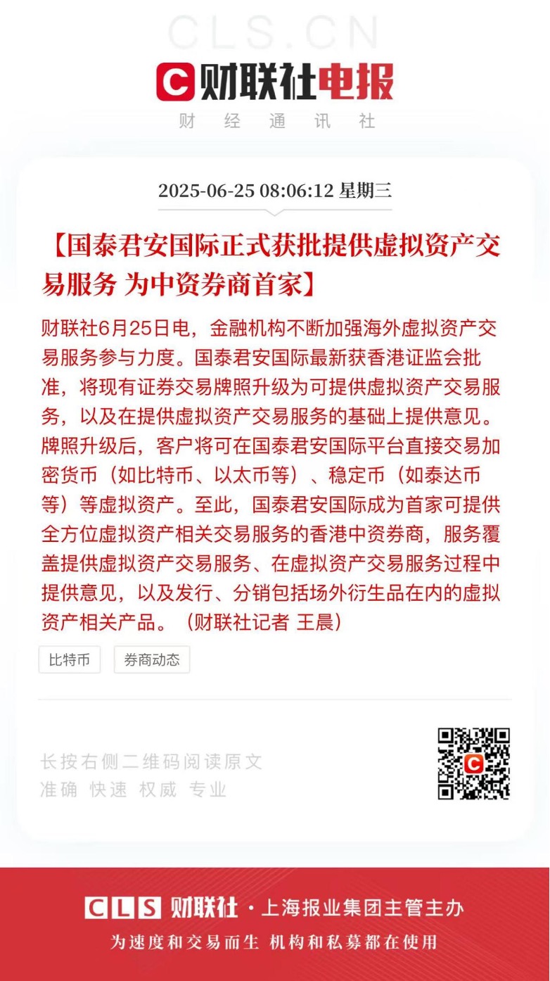 这一突破意味着,国泰君安国际的客户不久将能通过其平台,直接交易包括比特币(BTC)、以太坊(ETH)等主流加密货币,以及泰达币(USDT)等稳定币在内的多种虚拟资产。