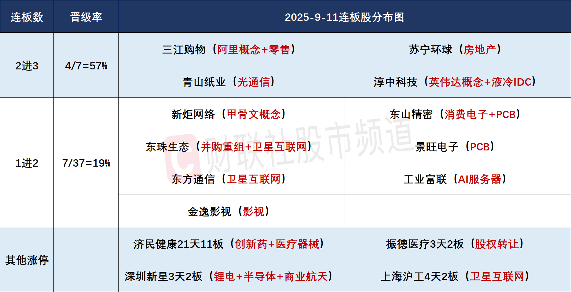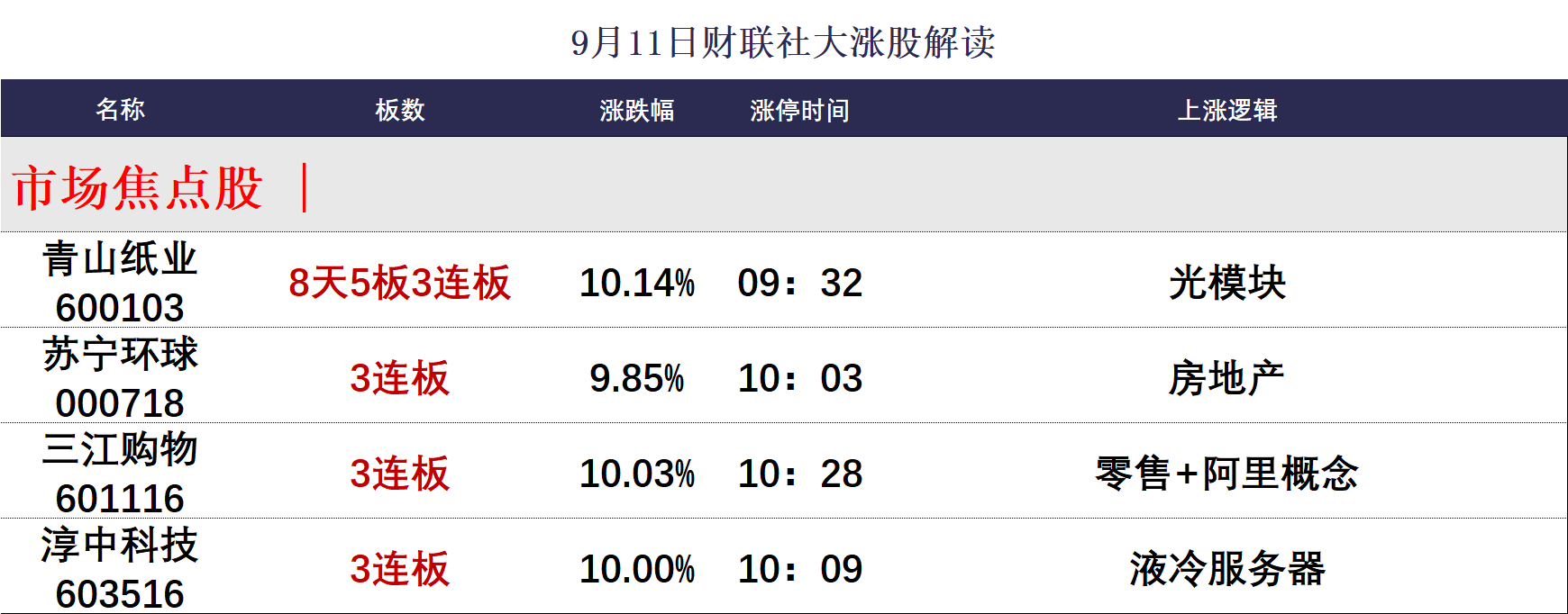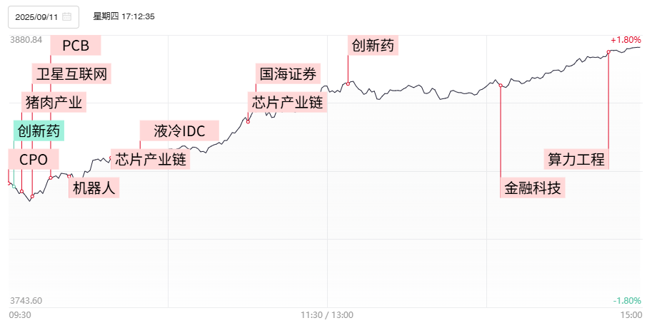 财联社9月11日讯,今日87股涨停,15股炸板,封板率为85%,三江购物、淳中科技、苏宁环球3连板,青山纸业8天5板,济民健康12天6板,东山精密5天3板,腾景科技20cm9天3板。市场全天持续走强,三大指数强势反弹,创业板指和深成指双双再创年内新高。沪深两市成交额2.44万亿,较上一个交易日放量4596亿。盘面上,市场热点轮番活跃,个股涨多跌少,全市场超4200只个股上涨。板块方面,CPO、PCB、液冷服务器等板块涨幅居前,贵金属、油气、旅游等板块跌幅居前。截至收盘,沪指涨1.65%,深成指涨3.36%,创业板指涨5.15%。