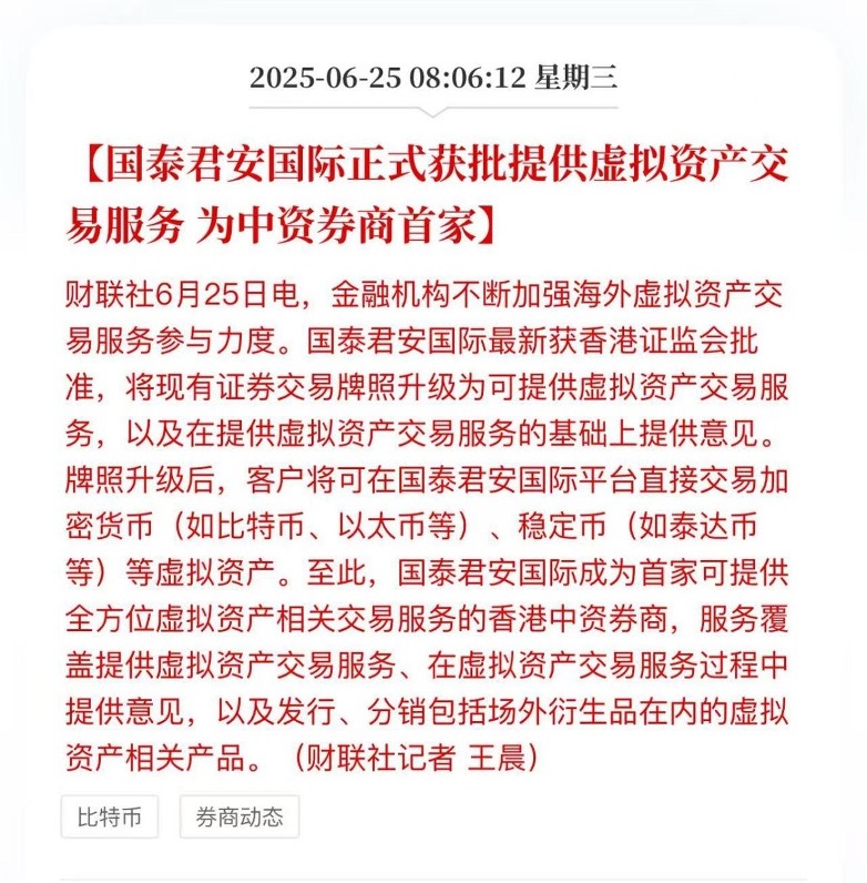 在创新药调整的空窗期,稳定币接过资金,成为近期市场中表现最好的板块。6月24日晚间,国泰君安国际官微在6月24日深夜更新了一条内容:《国泰君安国际正式获批提供加密货币等虚拟资产交易服务》,财联社也第一时间进行了报道。25日一早,中资券商拿下虚拟币交易牌照的消息已经在盘前炒热。