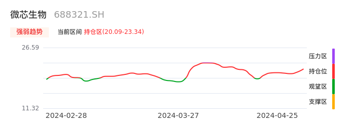 我们来看一下该股的九方特色指标强弱趋势的情况:微芯生物自04月17日从观望区上穿到持仓区。股价近期在多头区域持续强势上扬,上升动能仍较为充足,可积极关注。后续重点关注上方压力位:23.34元是否能突破上攻。