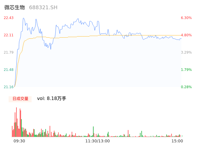 04月25日,微芯生物收报22.02,股价涨幅4.36%,成交金额1.81亿元,换手率1.99%。