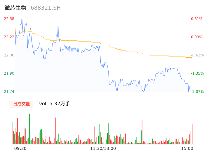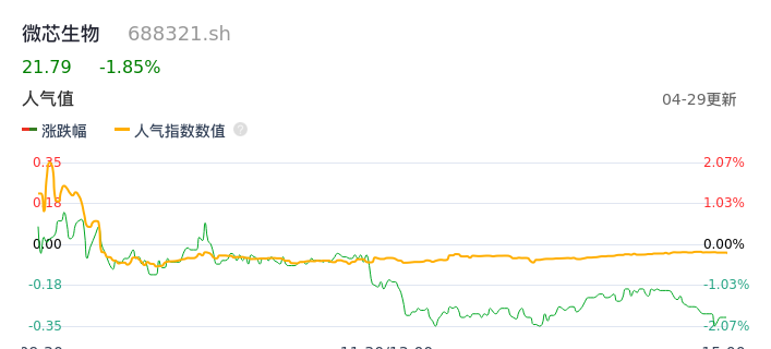 04月29日,微芯生物收报21.79,股价涨幅-1.85%,成交金额1.17亿元,换手率1.29%。