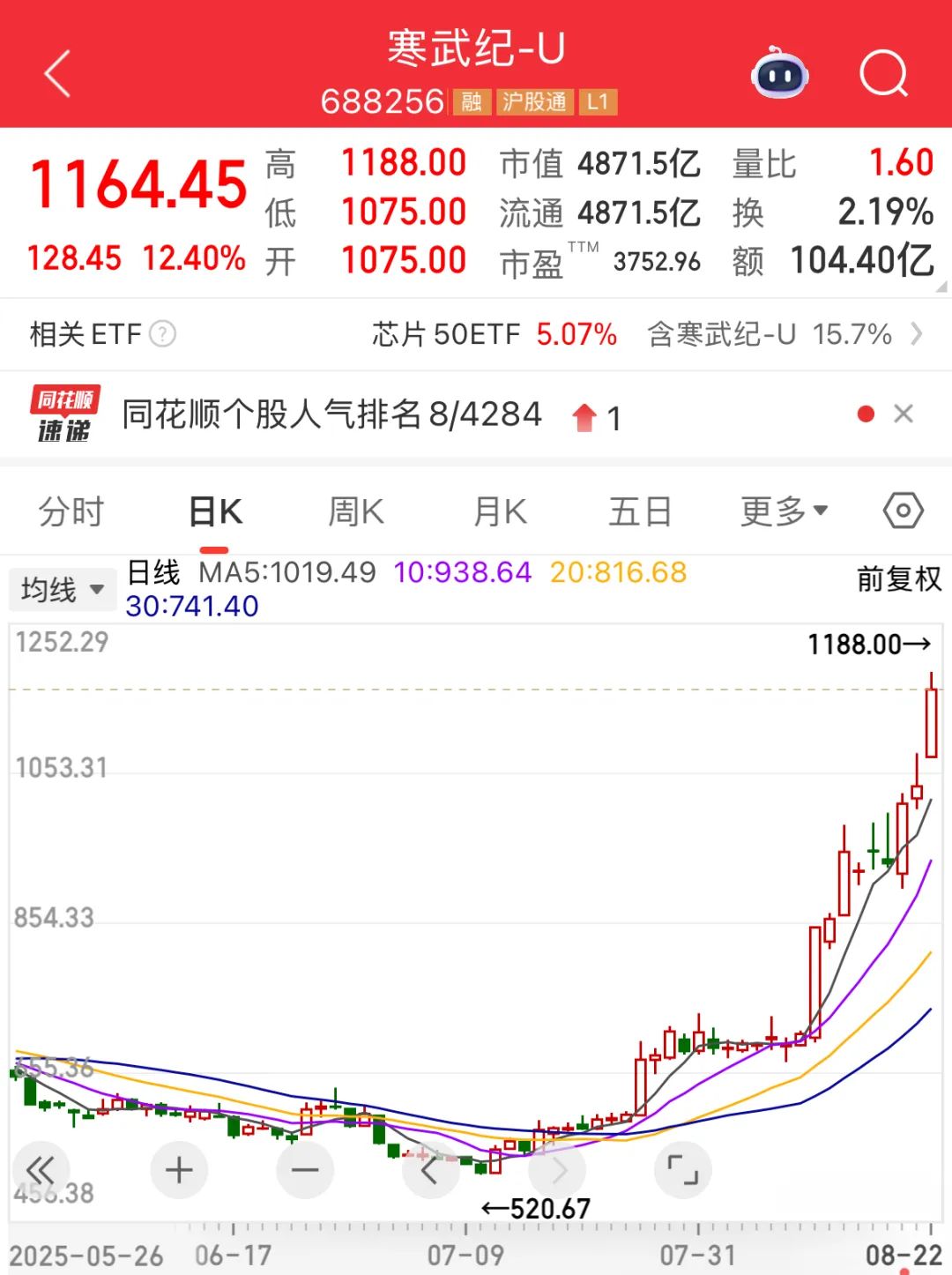 今日早盘,A股AI芯片板块集体上涨,截至收盘,概念股平均涨幅达到5.7%,科德教育、云天励飞-U“20CM”涨停;海光信息、寒武纪-U涨幅均超过10%,其中寒武纪-U盘中最高上涨14.67%,总市值一度超过中芯国际居于科创板首位。