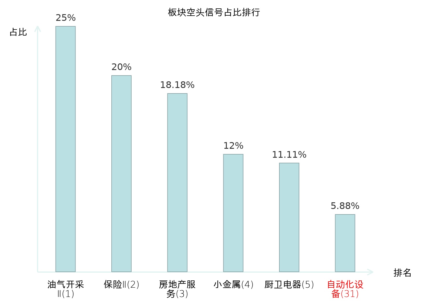 全市场所有行业板块中主力空头信号占比排名中,油气开采Ⅱ板块位居第一。装修建材板块名次提升最快,较昨日上升117位。