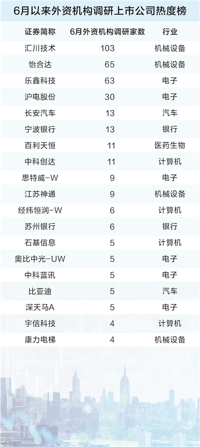 具体来看,最受外资机构关注的上市公司是汇川技术(300124.SZ),该公司是国内工业自动化龙头企业。6月以来,汇川技术举办了十余场各类调研活动,合计接待外资机构超过100家,包括摩根士丹利、瑞银、莱扎德资产管理公司(Lazard Asset Management)等。